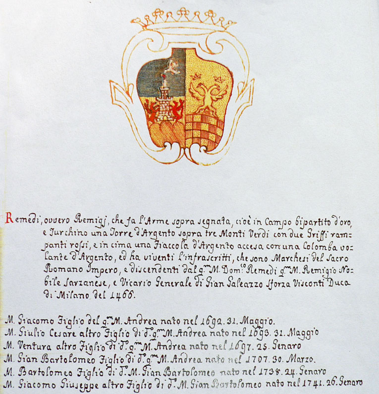 Fra le carte prodotte dalla famiglia Remedi, si segnalano contratti e documentazione fiscale e giuridica dei secoli XVIII e XIX. Ad esse sono inoltre uniti documenti della famiglia genovese dei Furia, costituiti, per la quasi totalità, da manoscritti relativi a normative, formulari, sentenze del secolo XVIII. Di particolare evidenza, in quanto già segnalate nella dichiarazione di notevole interesse storico emessa nel 1965, sono i registri relativi alla “vicinanza” di Carrara per gli anni 1570 – 1592; 1768; 1781 – 1864 (questi ultimi in unione con la comunità di Codena), importanti fonti per la conoscenza delle vicende amministrative e fiscali del territorio carrarino.