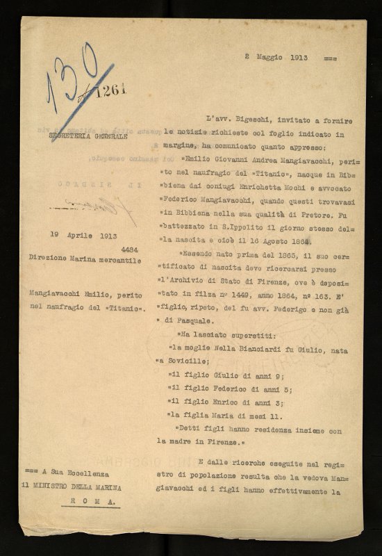 Tra i circa 40 nostri connazionali a bordo, per lo più imbarcati tra l’equipaggio, pochissimi viaggiavano con la qualifica di passeggero: e proprio uno di questi è riemerso dal passato attraverso le pagine ingiallite di un fascicolo della serie Affari sfogati dal sindaco, datato 1913 e conservato presso l'Archivio storico del Comune di Firenze (collocazione CF 4742). Il Ministero della Marina mercantile ed il Consolato italiano a Londra chiedono al primo cittadino, marchese Corsini, gli esatti dati anagrafici di un italiano perito nel più celebre naufragio della storia, necessari a chiudere definitivamente l’affare lettera A, n. reg. 1261 dell’ anno 1913.
