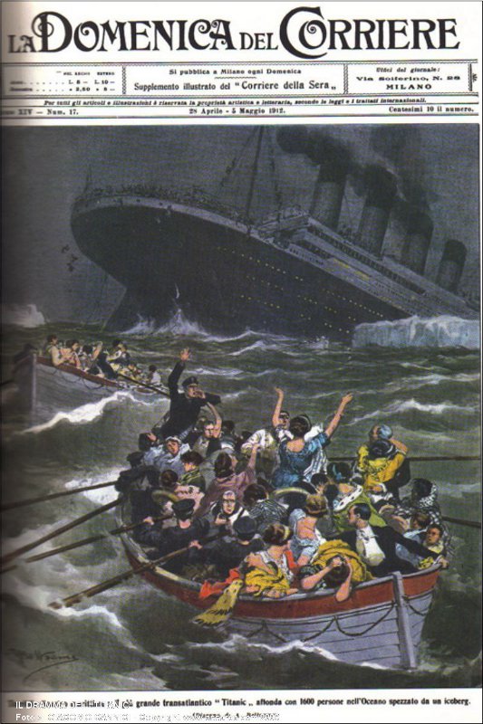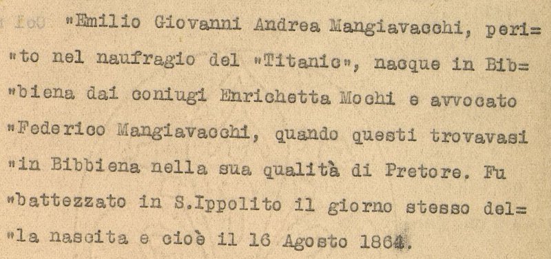 Il nome è quello di Emilio Mangiavacchi (anche se in quasi tutte le liste passeggeri risulta registrato come Serafino Emilio), nato a Bibbiena il 16 agosto 1864, un padre pretore ed una vita quanto meno avventurosa. Emigrato in Cile nel 1890, vi resta fino al 1902, lavorando per le ferrovie locali e contemporaneamente prestando servizio come pompiere volontario presso la Cuarta Compania de Bomberos di Concepciòn. Nel 1903 torna in patria, a Firenze, e qui incontra la futura moglie, Nella, originaria di Sovicille: il loro primogenito nasce ancor prima del matrimonio, poi le nozze ed infine ancora l’America, stavolta quella del Nord. A New York il nostro eroe trova un buon posto in banca, che gli frutta il rispettabile stipendio di 100 dollari al mese, mentre la famiglia cresce: l’inizio dell’anno 1912 vede Nella incinta per la quarta volta, mentre Emilio si appresta a tornare temporaneamente a Firenze per motivi di salute e per regolarizzare definitivamente il riconoscimento del primo figlio. L’atto notarile relativo porta la data del 29 marzo: mancano solo pochi giorni all’incontro col Titanic. Emilio ha solcato il mare più volte, su navi certamente importanti, ma un transatlantico di quella stazza è un’emozione anche per lui. Tanto più che a bordo si trova addirittura un ufficio postale, da cui i passeggeri potranno spedire messaggi grazie al nuovo telegrafo senza fili inventato da Guglielmo Marconi: e proprio Emilio, nel 1903, aveva tradotto in spagnolo una conferenza dello scienziato per conto del quotidiano cileno El Sur.