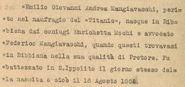 Nella giornata del 15 aprile l’ansia, nella casa di New York, cresce col passare delle ore. Nessuna traccia della nave attesa in porto. E le prime, frammentarie notizie di un disastro dalle proporzioni inimmaginabili. La piccola Maria Emilia –che non conoscerà mai suo padre- nascerà tre mesi più tardi, ed alla fine del 1912 si trasferirà con tutta la famiglia a Firenze: mentre la vedova Mangiavacchi si ricongiungerà al compagno della sua vita a 48 anni esatti dalla scomparsa di lui, il 14 aprile 1960.