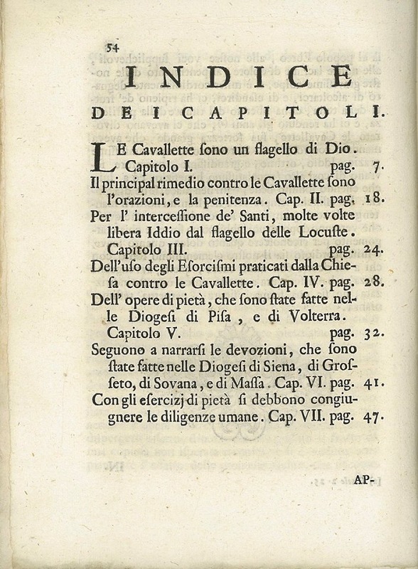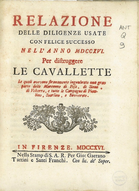 Di questo evento rimane memoria in un libretto che comprende le relazioni di studiosi designati dall'allora Granduca Cosimo III incaricati di studiare la natura, la proliferazione di questi insetti e i modi per demolirli e la “Relazione delle devozioni ed opere di pietà che si son fatte nell'Anno 1716 per ottenere da Dio la grazia di discacciare le cavallette che infestavano le Maremme di Pisa, di Siena e di Volterra” di cui pubblichiamo alcune immagini.