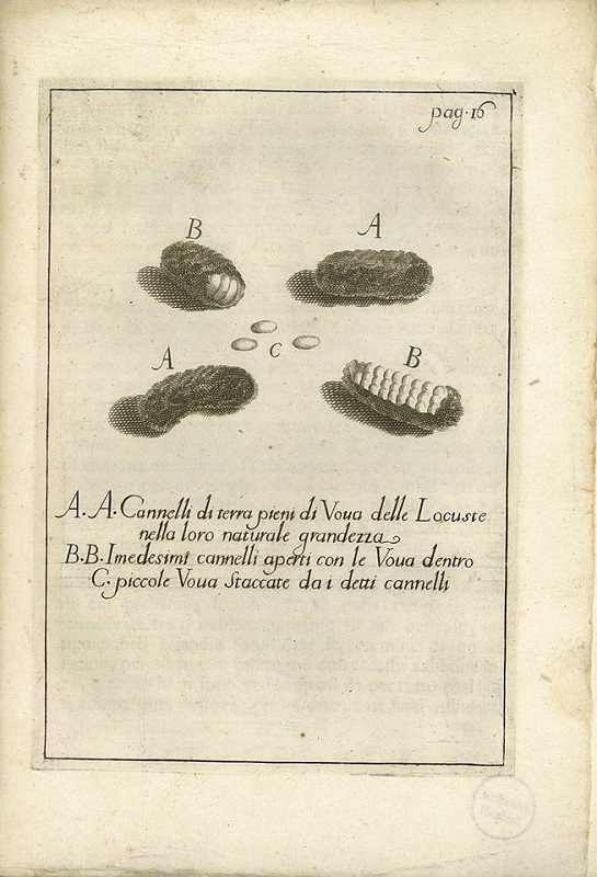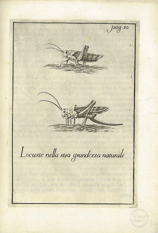 «[...] dalla parte del Mare comparir sopra quelle campagne uno stuolo immenso delle predette Locuste volanti per l'aria, così folto, ed opaco, che poteva oscurare il Sole, a guisa di una densa nube, il quale folto stuolo d'insetti fu da loro veduto incontinente posarsi, e spargersi sopra quella campagna, occupando, e cuoprendo un assai largo paese. [...]»