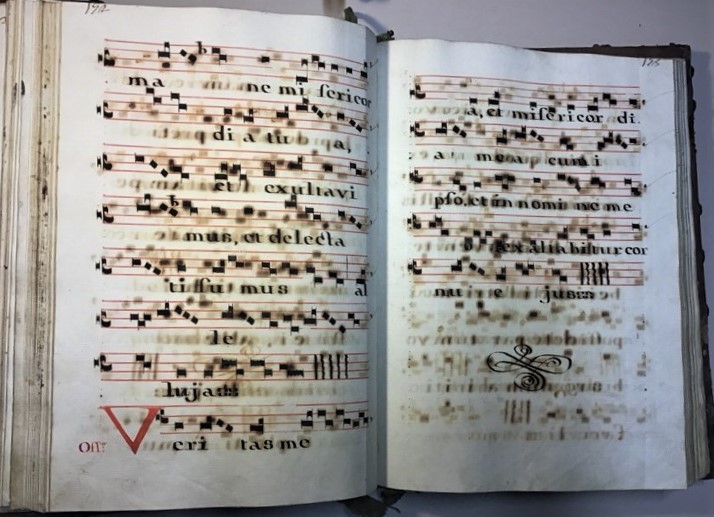 Il secondo Antifonario che sarà oggetto del restauro è invece risalente al XVIII secolo. Si tratta di un codice cartaceo che venne fatto comporre nel 1738 dal Priore della Chiesa di Castello Antonio Alessandro Avvisi. Anche di questo Codice, che si pone in continuità col primo costituendo una parte degli arredi Liturgici della Chiesa, ne dà testimonianza il Priore Giannini, il quale ci parla di un “Libro da Coro segnato B, con 370 pagine di Carta Reale, sue coperte di Legno foderate di cuoio, imbullettate di metallo, con fibbie, e bruco d’ottone, segnali di nastro di filaticcio verde, che contiene le messe per tutte le Solennità e Feste principali dell’Anno con i Comuni, Kyrie, Gloria, Credo, Sanctus, Agnus Dei per tutti i diversi riti. Questo Libro fu fatto dal Priore Antonio Alessandro Avvisi nell’Anno 1738”.