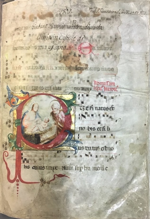 Nelle sue memorie, infatti, il Giannini ci parla di “Un libro da coro segnato A con 360 pagine di cartapecora, due coperte di legno, foderato di cuoio, imbullettato d’ottone, con due cigne di cuoio per chiuderlo con le sue estremità d’ottone, bruco d’ottone e segnali di nastro di filaticcio verde, nel quale si contengono tutte le messe cantate sulle note dalla festa del Santo Natale al giorno di Pasqua, tutti i Santi e Madonne ch’accadono in quel tempo, dalla vigilia di S. Andrea apostolo a tutto il dì di S. Agata, tutti i Comuni, Messe Votive e dei Morti, con i Kyrie, Gloria, Sanctis, Agnus Dei. Questo libro fu comprato dal Priore Gaetano Giannini nell’anno 1797 quando era vice-priore della Chiesa di S. Pietro in Gattolino di Firenze, e portato a questa chiesa [di Santa Maria in Castello n.d.r.] il dì 24 febbraio 1802, stimato dai periti Lire 54 Soldi 3 Denari 10”.
