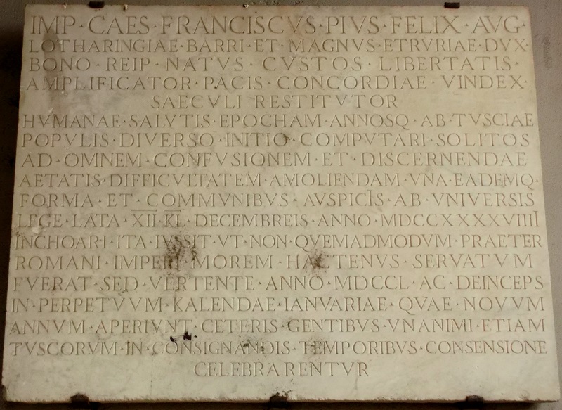 Questa situazione venne sanata solo a metà Settecento quando Francesco Stefano di Lorena saeculi restitutor, con decreto del 20 novembre 1749, abolì gli usi precedenti e ordinò che in tutto il territorio toscano il nuovo anno cominciasse il 1º gennaio seguente. Come ricordano le lapidi dettate dall’erudito Giovanni Lami e affisse sia a Firenze, sotto la loggia dei Lanzi, che a Pisa, sotto il palazzo comunale, a partire dal 1° gennaio 1750 cessava l’aporìa delle datazioni, sostituite dallo Stile moderno o della Circoncisione che fa iniziare l’anno il primo gennaio, in occasione della circoncisione di Gesù e, come sappiamo, ancora oggi largamente dominante.