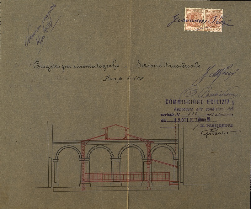 Si tratta della richiesta di permesso per la costruzione del cinematografo Roma presentata nel 1928 dal signor Giovanni Pieri nell’interesse di Ottorino Bencivenni: in un primo momento il parere della Commissione edilizia fu contrario alla costruzione “considerato che le porte di sicurezza non si aprono sulla strada ma su di un angusto corridoio che ha l’uscita a mezzo di una sola porta sulla strada”. Inoltre con il nuovo edificio sarebbero peggiorate “le condizioni di aria e di luce dei fabbricati laterali”: il fascicolo contiene infatti anche un ricorso da parte dei proprietari limitrofi e degli inquilini che non vedevano di buon occhio il fatto che al posto del preesistente giardino sorgesse quel locale da adibirsi “a scopo esclusivamente voluttuario”.