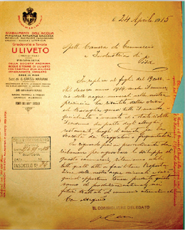 Se ne propongono due esempi in due ambiti completamente diversi. Lo stabilimento delle acque Uliveto ebbe maggiori problemi nella fornitura di alberghi e case di cura a causa del calo del turismo, e propose l’agevolazione del commercio internazionale. L’industria laterizia Leoncini di Pontedera ebbe un brusco arresto nella produzione proprio in concomitanza dello scoppio del conflitto ed augurò la vittoria dell’Italia nel più breve tempo possibile per poter nuovamente tornare allo stato di pace.
