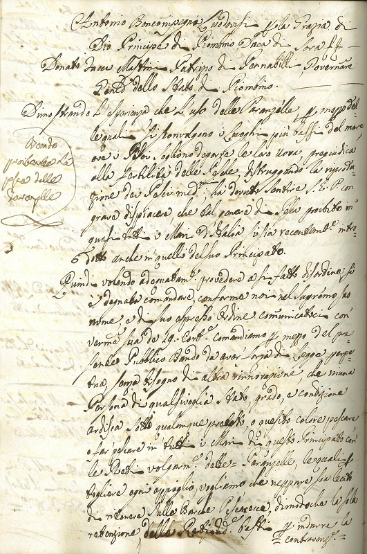 Quindi […] comandiamo […] che niuna persona di qualsivoglia Stato, grado, e condizione ardisca […] calare pescare o far pescare in tutti i mari di questo Principato con le reti volgarmente dette Paranzelle, le quali per togliere ogni appiglio, vogliamo che neppure sia lecito di ritenere sulle Barche Pescherecce, dimodoché la sola retenzione delle reti suddette basti per indurre la contravvenzione, benché non si provasse che i Pescatori ne abbiano fatto uso in mare.