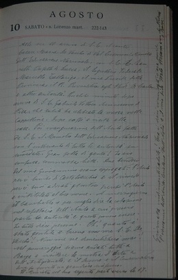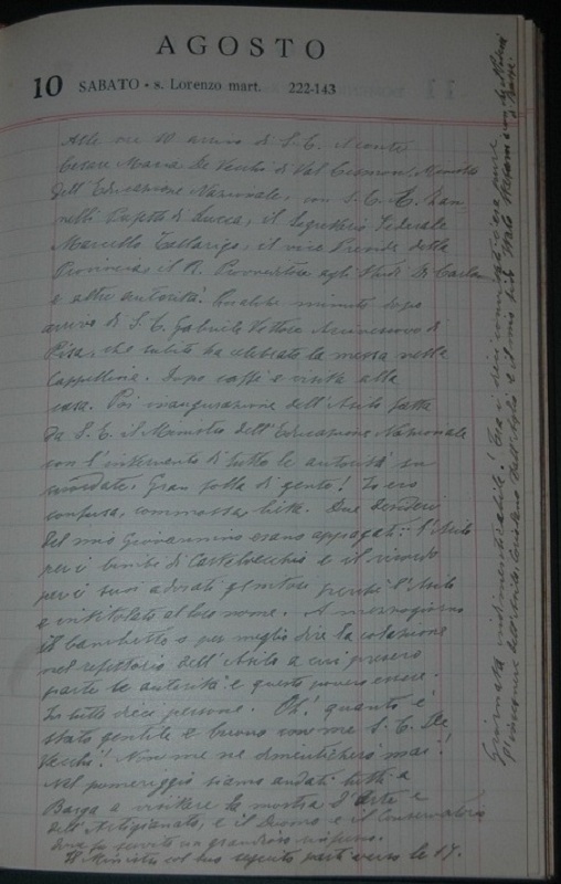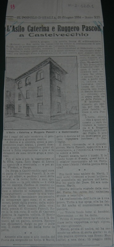Alle ore 10 arrivo di S.E. il conte Cesare Maria De Vecchi di Val Cismon, Ministro dell’Educazione Nazionale, (…) e altre autorità. Qualche minuto dopo arrivo di S.E. Gabriele Vettori Arcivescovo di Pisa, che subito ha celebrato la messa nella cappellina. Dopo caffè e visita alla casa. Poi inaugurazione dell’Asilo fatta da S.E. il Ministro dell’Educazione Nazionale con l’intervento di tutte le autorità su ricordate. Gran folla di gente! Io ero confusa, commossa, lieta. Due desideri del mio Giovannino erano appagati: l’Asilo per i bimbi di Castelvecchio e il ricordo per i suoi adorati genitori perché l’Asilo è intitolato al loro nome. A mezzogiorno il banchetto o per meglio dire la colazione nel refettorio dell’Asilo a cui presero parte le autorità e questo povero essere. In tutto dieci persone. Oh! quanto è stato gentile e buono con me S.E. De Vecchi! Non me ne dimenticherò mai! Nel pomeriggio siamo andati tutti a Barga a visitare la mostra d’Arte e dell’Artigianato, e il Duomo e il Conservatorio dove fu servito un grandioso rinfresco. Il Ministro col suo seguito partì verso le 17.