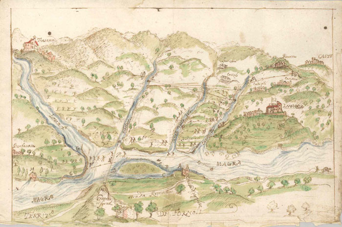 Il fiume Magra, nel suo storico rapporto con la vita degli abitanti della Lunigiana, segnava il confine tra i feudi e il dominio Granducale: quasi sempre il confine era fissato nel ramo più grosso dell’acqua; periodicamente il corso del “ramo più grosso” si spostava e poteva accadere che, dopo una piena, il confine mutasse in danno di una comunità e a vantaggio di quella prospiciente.