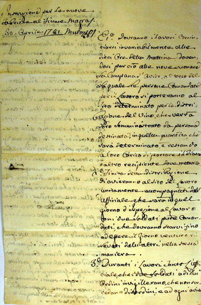Azzo Giacinto III indica la necessità di realizzare un reddito di 300 scudi da impiegarsi nelle maestranze e per comperare il materiale appoggiato in parte al reddito della comunità che ne acquista il dominio ed in parte ai comunisti che equilibratamente investiti di questi terreni sottratti al fiume avranno in futuro un non meno indifferente aumento di benefici. Ecco i nuovi capitoli del 5 gennaio del 1780: