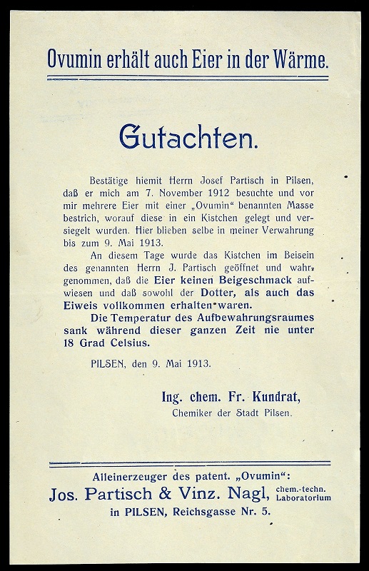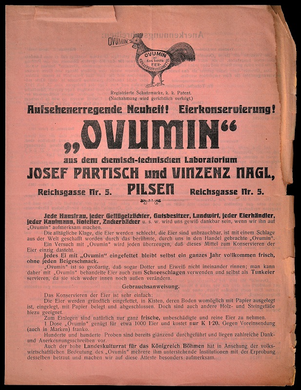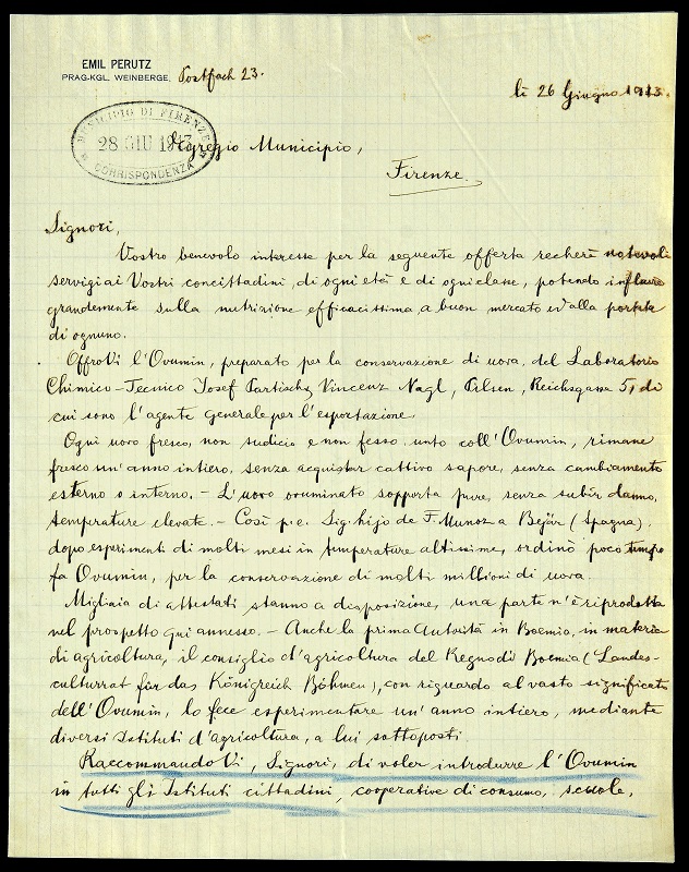 Il prodotto pubblicizzato in un carteggio del 1913, appartenente agli affari sfogati dal sindaco di Firenze marchese Filippo Corsini (ASCFi, Affari generali, lettera A, n. reg. 1788, anno 1913, CF 4742), supera tuttavia molte delle più audaci fantasie culinarie in materia. E’ il signor E. Perutz, agente generale del Laboratorio Chimico-tecnico Josef Partisch, Vincenz Nagl, Pilsen che scrive, da Praga, il 26 giugno 1913, sottoponendo all’attenzione del Municipio fiorentino un mirabolante preparato per la conservazione delle uova, l’OVUMIN, che a suo dire “recherà notevoli servigi ai vostri concittadini, di ogni età e di ogni classe, potendo influire grandemente sulla nutrizione efficacissima a buon mercato ed alla portata di tutti”. Come spiega Perutz, “ogni uovo fresco, non sudicio e non fesso, unto coll'Ovumin, rimane fresco un'anno intiero, senza acquistar cattivo sapore, senza cambiamento esterno o interno. L'uovo ovuminato sopporta pure, senza subir danno, temperature elevate”. E a supporto di tale sorprendente affermazione vengono riferite le esperienze di consumatori entusiasti, quali ad esempio “il Sig. hijo de F. Munoz a Bejar (Spagna)”, il quale “dopo esperimenti di molti mesi in temperature altissime, ordinò poco tempo fa Ovumin, per la conservazione di molti millioni di uova”, oppure “la prima autorità in Boemia in materia di agricoltura, il consiglio d'agricoltura del Regno di Boemia (Landes-culturrat fur das Konigreich Bohmen)” che “con riguardo al vasto significato dell'Ovumin, lo fece esperimentare un'anno intiero, mediante diversi Istituti d'agricoltura, a lui sottoposti”. Non manca un prospetto annesso, che riproduce una parte delle migliaia di attestati (oggi diremmo recensioni!) disponibili, a testimonianza dell’efficacia dell’invenzione. Sicuro del fatto suo, Perutz si spinge fino a raccomandare agli amministratori locali di “voler introdurre l'Ovumin in tutti gli Istituti cittadini, cooperative di consumo, scuole, ospedali, ecc.”, come pure di “distribuirne gratuitamente fra le famiglie povere” poiché “coll'introdurre l'uovo ovuminato, sempre fresco, resistentissimo in ogni stagione in gran parte dei focolai poveri o meno agiati, contribuirete con piccola spesa immensamente al benessere popolare”. Termina poi con indicazioni più pratiche e molto meno idealistiche: “Un chilogrammo di Ovumin basta per quattordici mila uova. Il prezzo è di Lire 12 (dodici) il chilogrammo, reso in stazione di Praga, pagamento a consegna della merce allo speditore, in stazione di Praga (Boemia)”.