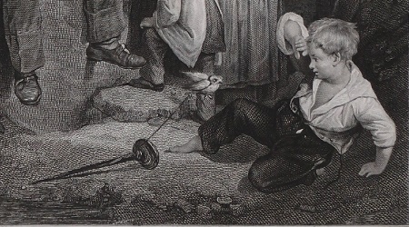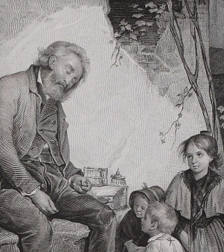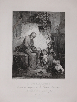 Il cortile chiuso da una parete diroccata parzialmente rivestita con assi lignee malamente inchiodate l’una sull’altra ed un angolo di cielo in lontananza visibile oltre i tetti di un nucleo abitato, costituiscono lo scenario povero e trasandato ideale per ambientare la scena. Vi è rappresentato un uomo seduto su un masso di pietra, vestito poveramente e con la testa reclinata sulla spalla sinistra, catturato nell’attimo in cui chiude gli occhi mentre attrae l’interesse di quattro bambini i quali, intorno a lui, lo guardano incuriositi e divertiti. L’uomo tiene in mano una gabbia per volatili ed un bimbo in primo piano sta giocando con uno strumento di lavoro che l’uccellatore ha appoggiato in terra, vicino ad un sacco di stoffa e ad altri strumenti del mestiere. Sulla sinistra si legge la firma e la data 1850.
