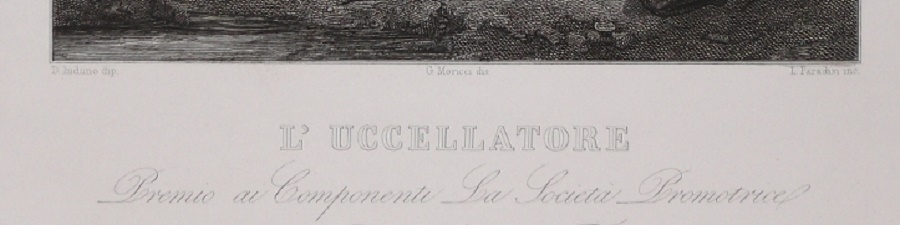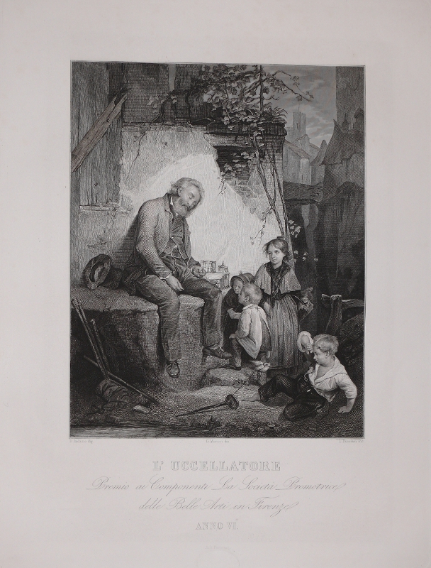 La stampa è una fonte storica di primaria importanza, in quanto testimonianza di un originale, la cui ubicazione ad oggi è ignota. Essa rappresenta anche la traccia visiva, sopravvissuta tra le carte della Società delle Belle Arti, del soggiorno fiorentino dell’artista lombardo, iniziato probabilmente nei primi mesi del 1949. In questa città il pittore partecipa alle mostre della Società Promotrice: nel 1849 con i Contrabbandieri e La macchia d’inchiostro e, l’anno successivo, con l’opera L’uccellatore, appunto, la quale viene scelta dalla giuria artistica per essere incisa.