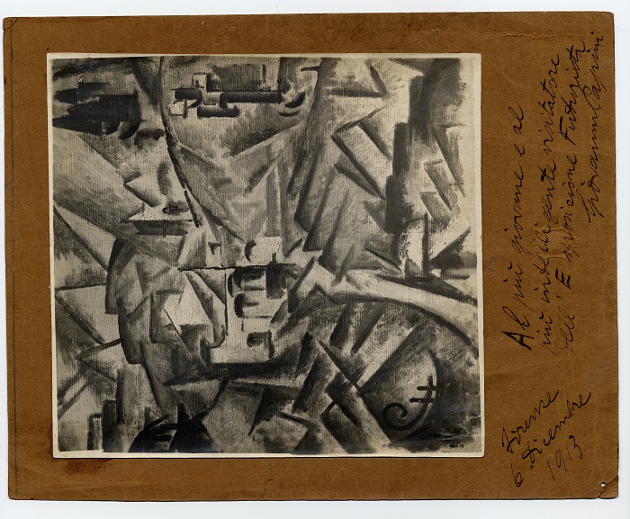 In occasione della Mostra futurista organizzata da “Lacerba” Primo Conti, appena tredicenne, rimane estasiato di fronte alle opere esposte. Così ricorda l’evento: “Facendomi largo a spallate e a colpi di gomito mi portavo da un angolo all’altro di quell’ambiente che mi accoglieva come fossi rientrato da un lungo viaggio, e non potevo fare a meno di urlare, fra tante urla, tutto quello che pensavo e sentivo. Intanto mi accorsi che un gruppo di giovani mi aveva adocchiato e mi veniva dietro senza perdere una mia parola”. Il gruppo era formato da Carrà, Marinetti, Soffici, Palazzeschi e Papini che dedicò al futuro amico e compagno di strada le parole presenti in un autografo in calce alla riproduzione fotografica del quadro di Ardengo Soffici Sintesi di un paesaggio autunnale dove si legge: “Al più giovane e al più intelligente visitatore dell’Esposizione Futurista. Firenze 6 Dicembre 1913”. (cfr. P. Conti, La Gola del merlo, memorie provocate da G. C. Millet, Firenze, Sansoni, 1983, p.30)