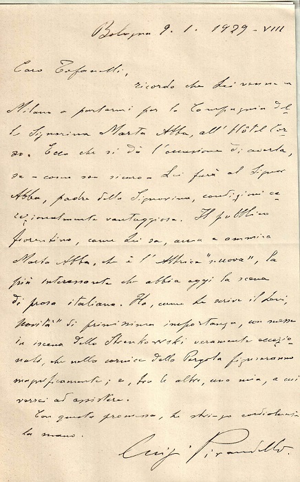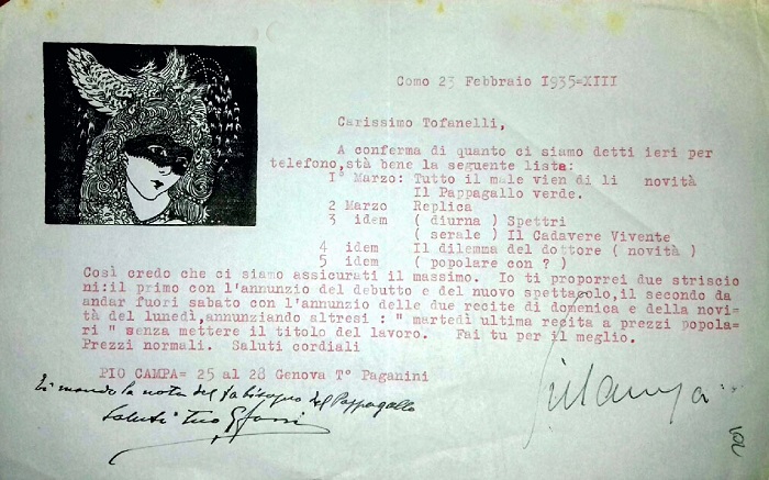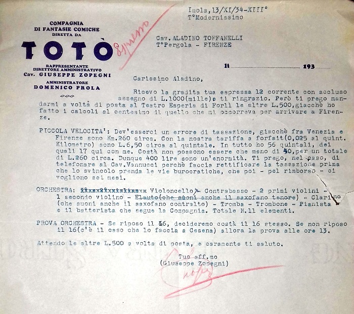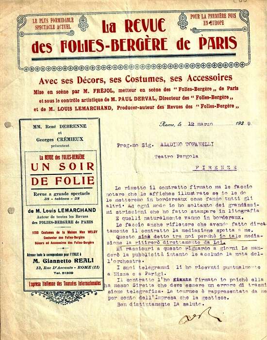 Il nuovo indirizzo di gestione da un lato, confermava le precedenti strategie teatrali che avevano trasformato l’antico tempio dell’opera a Firenze in un teatro dedito soprattutto a spettacoli di prosa o comunque a spettacoli musicali di puro intrattenimento; dall’altro, grazie ad una fitta rete di contatti sia a livello nazionale che internazionale, assicurava rappresentazioni di qualità di qualunque genere, ospitando così le più celebri formazioni che operavano negli ambiti più diversi. Dall’operetta al varietà, con le troupes di Nella Regini e Carlo Lombardo. dei fratelli Schwarz, fino alla rivista di Totò; dal teatro dialettale, con le compagnie di Raffaele Viviani, Gilberto Govi, Angelo Musco o Cesco Baseggio, alla prosa per così dire “leggera”. Per quanto riguarda poi la prosa “d’arte”, come si diceva allora, il prestigio di cui godeva Tofanelli è documentato dai suoi nutriti carteggi con quasi tutte le compagnie “primarie” italiane. In mezzo ad essi spicca una lettera autografa di Luigi Pirandello del 1929, volta a segnalare il talento di Marta Abba che, dopo la lunga e coinvolgente collaborazione con il drammaturgo siciliano, aveva appena costituito una propria formazione artistica.