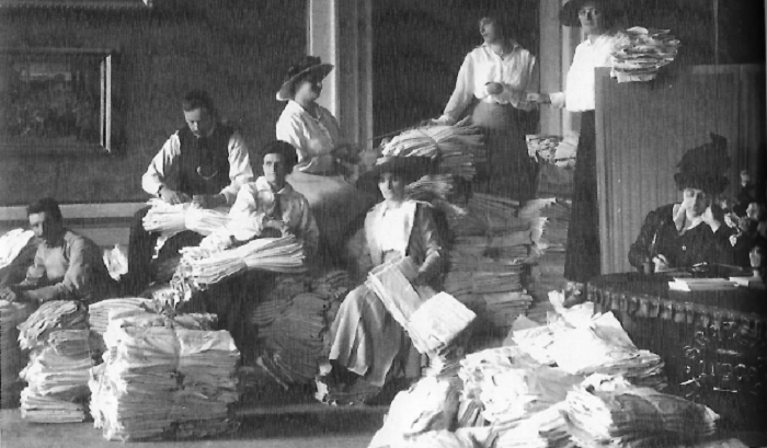 Volontarie preparano pacchi di biancheria da inviare al fronte, Lucca, Palazzo Ducale, 1916