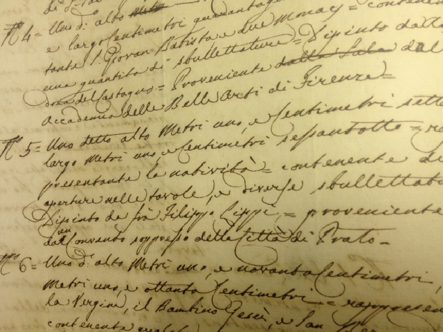 Sappiamo che il 30 aprile 1812 Giovanni Degli Alessandri, Presidente dell'Accademia di Belle Arti, per ordine del Prefetto del Dipartimento dell’Arno (lettera del 13 febbraio 1812, in AABBAA, 8.1/8, c.15), si trova nel Convento soppresso di Santa Caterina, all’epoca sede del Conservatorio di Arti e mestieri di Firenze, dove erano stati raccolti i quadri destinati dal sig. Denon, Direttore del Museo Imperiale di Parigi, per essere trasferiti nel Museo medesimo, per assistere alle operazioni di verifica, riconoscimento e misurazione dei suddetti quadri, nonché del loro imballaggio all’interno di casse costruite appositamente per la spedizione (AABBAA, 8.1/7, fasc. 33). Tra le opere d’arte inviate nell’occasione a Parigi c’è, appunto, anche la Natività di Filippo Lippi, proveniente da un Convento soppresso della Città di Prato. Detto dipinto, scrive l’Alessandri, è alto metri uno e centimetri settanta e largo metri uno e centimetri sessantotto e presenta due aperture nelle tavole e diverse sbullettature.