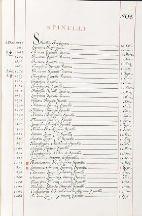 Famiglia fiorentina, fin dal Duecento attiva e presente nella corporazione dell’Arte della Seta, settore nel quale gli Spinelli continuarono ad investire anche nei secoli successivi. Il cursus honorum dei suoi membri è analogo a quello di altri casati di origine mercantile: nel 1329 Cione di Spinello fu il primo ad assumere la carica di Gonfaloniere, onore raggiunto dagli Spinelli altre cinque volte, così come diversi di loro furono priori nel governo della Signoria.
