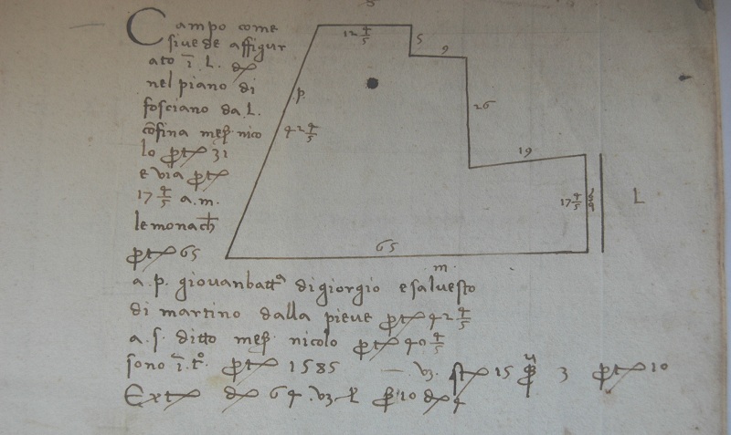 Seguono i possessi dell’Opera di San Pietro: otto campi, dodici prati, tre selve, più la chalonicha (canonica) co[n] piu istanzie e co[n] orto e p[er]gole i[n] l[uogo] detto i[n] Castelnuovo, da L[evante] co[n]fina le mura castellane, a Meridione ditt[e] mura el chiasso, a p[onente] el cimiterio e la strada, a s[ettentrione] el monisterio.