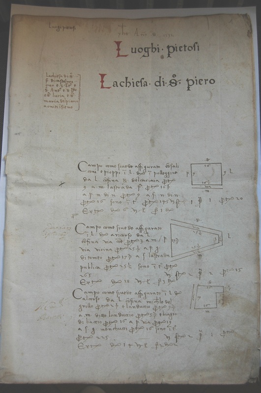 La prima pagina è aperta dalla dicitura Luogi pietosi. YHS . An[n]o D[omini] 1532. Luoghi pietosi, in inchiostro nero e rosso. Segue sulla sinistra della pagina l’elenco di una serie di chiese ed altari, vale a dire: La chiesa di S[anto] P[ietro] di Castelnuovo e S[an] B[ar]t[olome]o e S[ant]o Ant[oni]o e S[an] L[…]do e S[ant]a Lucia e S[ant]a Maria del Piano a oniti i[n]sieme; andando avanti nella lettura, si scopre che non tutti questi enti compaiono all’interno del terrilogio, mentre ve ne sono altri non nominati in apertura.