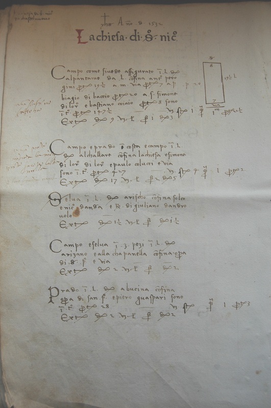 A questo punto inizia l’elenco dei beni veri e propri, in base all’ente di appartenenza. I possedimenti sono un centinaio: ci troviamo di fronte a quarantaquattro campi, trentuno prati, diciannove tra selve e boschi, due vigne e due “piagge” (i punti di secca presenti lungo il fiume Serchio).