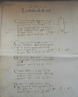Per ogni appezzamento di terreno si forniscono alcune informazioni quali il luogo di ubicazione , le dimensioni, la descrizione dei confini (laddove possibile con indicazioni legate ad edifici e strade, altrimenti con i nomi dei confinanti); talvolta la notizia è corredata da un disegno geometrico che ne delinea appena la forma. I campi, coltivabili o alberati , presentano su di sé manufatti quali case, metati o capanne; stessa cosa vale per i prati, le selve e le boscaglie o “cerrete” (da cerro, cioè quercia).