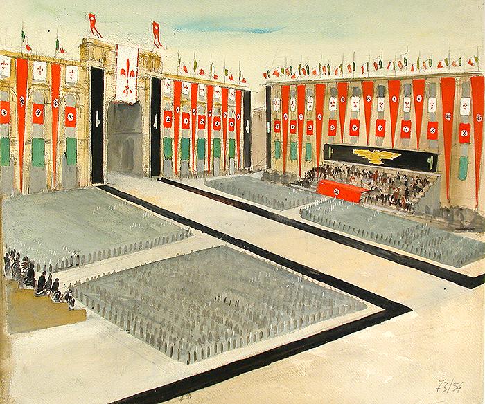La visita di Hitler a Firenze, il 9 maggio 1938, è un evento molto ben documentato. Innanzi tutto dalla stampa di regime, ripetitiva e pesantemente retorica. Poi, da moltissima documentazione iconografica: fotografie, studi grafici per allestire le vie di Firenze, cartoline illustrate, un documentario dell'Istituto LUCE.