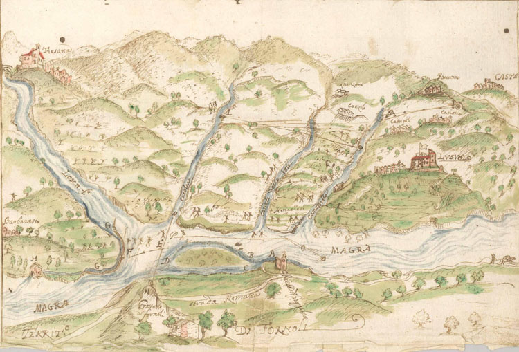 Invece della cartografia di grande scala, i territori lunigianesi tra il 1500 e il 1600, età di particolare proliferazione di una cartografia tematica del territorio, si sviluppano in rappresentazioni di piccola scala o addirittura schizzi prospettici o a volo d'uccello, inoltre, inizialmente la raffigurazione è un semplice schizzo eseguito per meglio illustrare le situazioni descritte attraverso i carteggi per passare progressivamente tra il secolo XVII e il XVIII ad una cartografia pittorica e poi ad una geometrica, con l'introduzione della trigonometria, con la triangolazione.