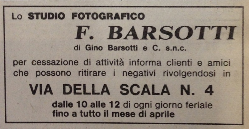 Invito della società Barsotti/Bardazzi ai clienti a ritirare i propri materiali, in occasione della chiusura della attività, 1982