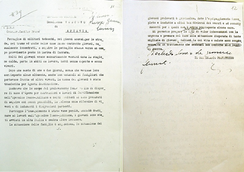 La maggior parte delle migliaia di cittadini deportati dal territorio apuano e lunigiano furono destinati ai campi di lavoro come quello di Turkheim, sottocampo di Dachau situato vicino a Monaco di Baviera. Prima della partenza per la Germania, gli ostaggi catturati venivano solitamente condotti e rinchiusi nelle ex-colonie presenti sul territorio, ora adibite a luoghi di raccolta e detenzione temporanea, come l’ex colonia “Italo Balbo” di Marinella o l’ex-colonia Vercelli di Marina di Carrara, cui tra l’altro si riferisce l’episodio citato nei documenti riportati. Questi testimoniano di una richiesta di informazioni, da parte delle autorità fasciste italiane, circa la situazione dei civili catturati e deportati già nel settembre del 1943.