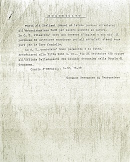 Già dal 17 settembre del 1943 le autorità fasciste inoltravano all’ufficio di collocamento l’informazione che il Comando tedesco di piazza aveva disposto che sul territorio non vi fosse la presenza di disoccupati. A tal proposito si faceva richiesta degli elenchi nominativi e si provvedesse a trovare rimedio.