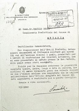 Il Direttore provinciale delle Corporazioni faceva richiesta al Commissario prefettizio di Apuania, degli elenchi nominativi degli operai renitenti al lavoro coatto, precettati per la costruzione dei rifugi antiaerei nel maggio 1943. La risposta fu pronta e minuziosamente dettagliata.