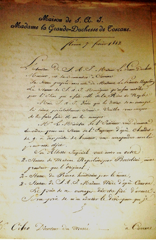 Non vi è ovviamente niente sulle commissioni private dell’epoca ricevute da Bartolini se non su quelle di incarico di Elisa Baciocchi per la sua Reggia di Marlia (Lucca). In questo periodo lo scultore eseguiva e controllava le repliche dalle opere di importanti autori da Canova a Chinard, Chaudet, Bosio, ma realizzava anche lavori di sua invenzione tra i quali il più importante fu la statua colossale di Napoleone ordinata dalla città di Livorno e oggi collocata a Bastia, e alcune statue e ritratti della famiglia Bonaparte.