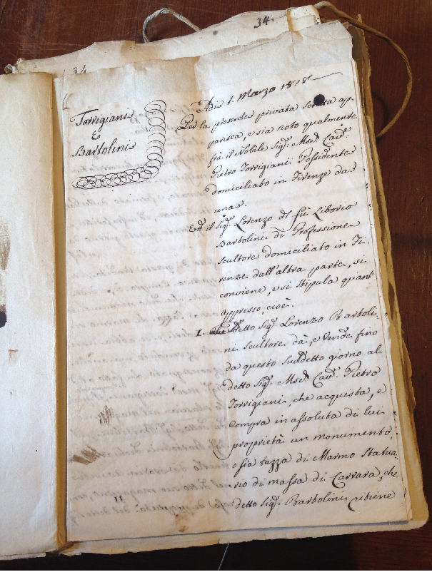 Particolarmente utile è risultata l’indagine nell’archivio Torrigiani Malaspina, ordinato e corredato di indici, che ha permesso di recuperare il contratto per una Grande Tazza, che avrebbe dovuto raffigurare il battesimo del figlio di Napoleone, re di Roma, commissionata da Elisa Baciocchi (1811 ca.). L’opera, sbozzata, ma non completata dal fregio, fu successivamente acquistata dal marchese Pietro Torrigiani (1773-1848) e avrebbe dovuto essere ornata da un bassorilievo esaltante Pietro Leopoldo I per essere poi collocata nel giardino Torrigiani in via del Campuccio a Firenze, iniziato su progetto di Luigi Cambray Digny.