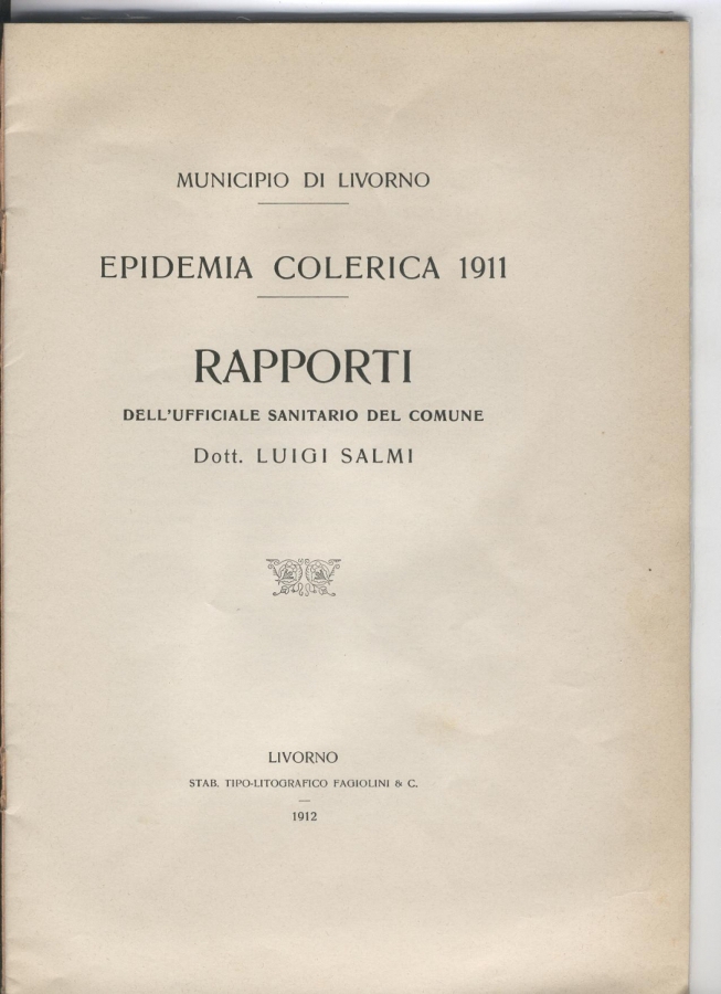Nell’estate del 1911 (nei mesi di luglio e settembre) la città di Livorno fu interessata da un’epidemia colerica di notevole entità, come riportato nel Primo rapporto sulla epidemia colerica 1911 redatto dall’Ufficiale Sanitario del Comune Dott. Luigi Salmi. L’epidemia di colera si sviluppò dai primi giorni del mese di luglio 1911 esattamente dal giorno 6 luglio con n. 2 casi; il giorno 9 nessuna caso…e si è mantenuta fino al giorno 23 luglio, non oltrepassando gli 8 casi …poi un crescendo del giorno 11 fino al 13  agosto. In totale si sono verificati 375 casi, dei quali 161 maschi e 214 femmine; sono morti n. 80 maschi e n. 106 femmine. La media della mortalità sarebbe fino ad oggi [14 agosto 1911] del 50% (cfr. Municipio di Livorno Epidemia colerica 1991 –  Rapporti dell’Ufficiale sanitario del comune Dott. Luigi Salmi, Livorno, Sta. Tipo-litografico Fagiolini & C., 1912; Archivio Storico del Comune di Livorno (da ora in avanti C.L.A.S.), serie Affari 1911).
