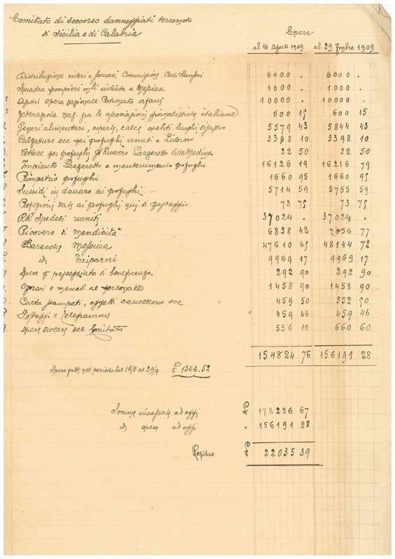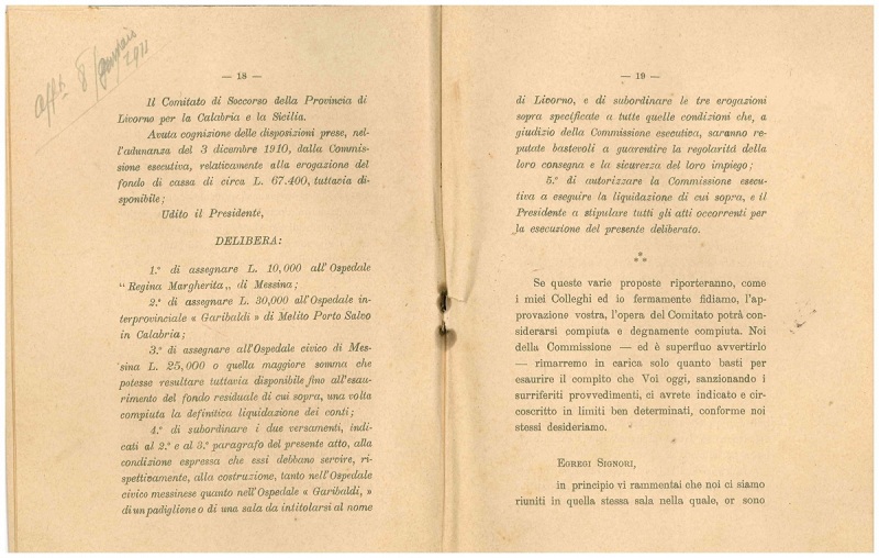 L’obiettivo del comitato era raccogliere fondi da tutta la provincia e fin dal 30 dicembre 1908 il vice presidente Orlando e i consiglieri comunali Sansoni, Liscia e Friedmann e i rappresentati dell’ospedale di Livorno erano già presenti sul territorio messinese insieme al corpo dei pompieri che offrì un significativo aiuto nelle operazioni di recupero e messa in sicurezza delle zone flagellate dalla calamità (con Delibera n. 31 del 8 gennaio 1909 la Giunta Comunale promuove un voto di incoraggiamento al comandante della squadra dei pompieri inviati per i luoghi del terremoto. La giunta esprime inoltre il suo compiacimento per il salvataggio da parte della squadra dei pompieri di un uomo e di una bambina estratti dalle macerie, CLAS Archivio Storico Comune di Livorno). Da subito emerse che la priorità era dare ricovero alle migliaia di persone sopravvissute al cataclisma.