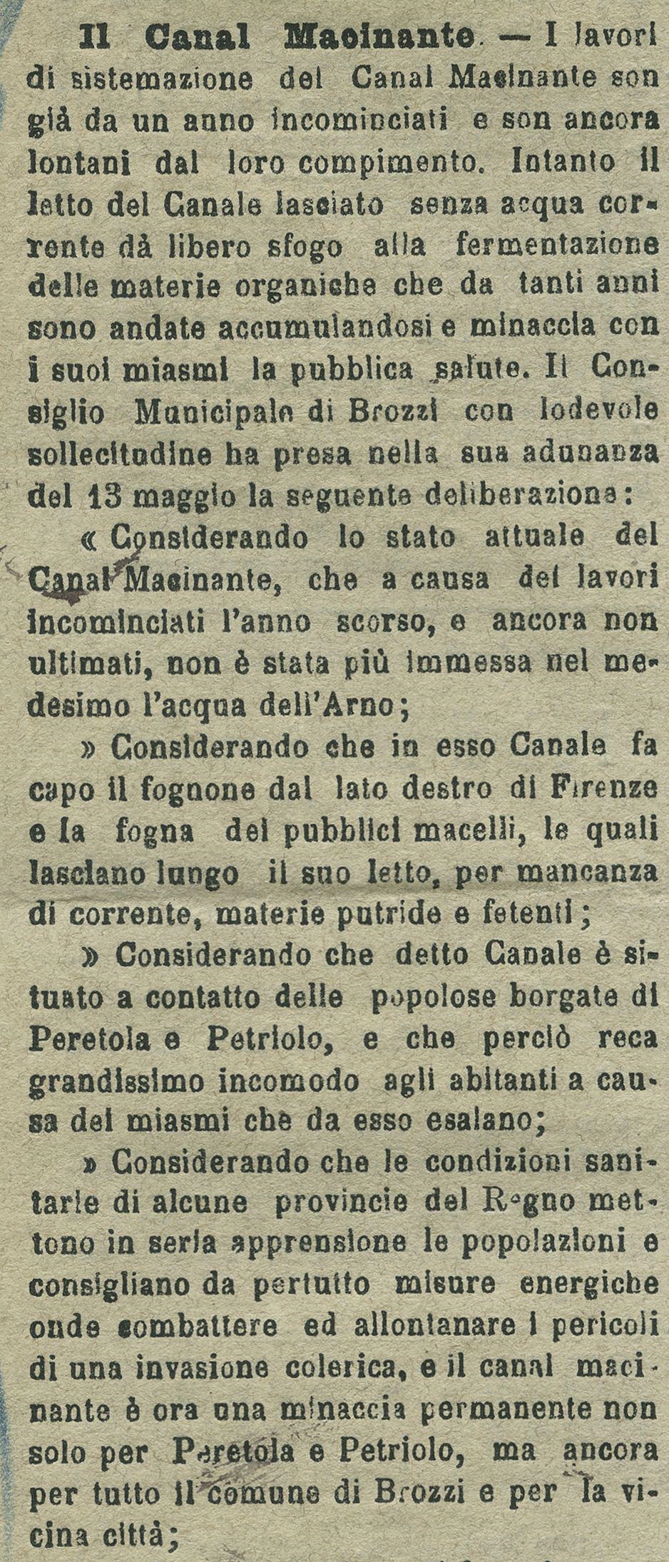 Dalla pescaia il canale corre quindi sotterraneo verso l’incrocio di via Montebello con via Curtatone, dove esiste un sistema di troppo pieno che rimanda in Arno le acque in eccesso; sotto la villa Favard, costruita nel 1857, si trovano inoltre le paratoie di sicurezza per la chiusura del canale e per la sua manutenzione. Da qui prosegue il suo corso sotto via Solferino fino ad arrivare a piazza Vittorio Veneto: la copertura di questo tratto fu effettuata a partire dal 1885 per “imperiose ragioni d’igiene”. I lavori erano inoltre finalizzati alla valorizzazione dell’area e alla realizzazione di un parterre sul fosso, che ormai riceveva diverse fogne, e furono affidati a Francesco Mattei, proprietario di molti stabili della zona. Il collaudo avvenne finalmente nel 1892, dopo che il protrarsi dei lavori aveva provocato non poche lamentele da parte di chi abitava lungo il corso del canale.