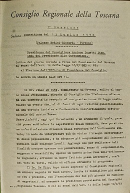 La storia dell’archivio del Consiglio di sviluppa in parallelo a quella della Regione. Dopo le prime elezioni amministrative regionali del 6-7 giugno 1970, e precedentemente all’insediamento del primo Consiglio, fu infatti costituita presso la Provincia di Firenze una Segreteria provvisoria per seguire i primi passi organizzativi, che si dotò subito di un registro di protocollo. Nella prima seduta del Consiglio, il 13 luglio, furono eletti l’Ufficio di Presidenza e il primo Presidente del Consiglio (Elio Gabbuggiani , PCI) e nella seduta successiva, il 28 luglio, furono nominati il primo Presidente della Giunta (Lelio Lagorio, PSI) e i suoi assessori. Tutta l’attività del Consiglio è rappresentata nell’archivio fin da questi primi passi: tra le serie principali ci sono infatti, ancora oggi, i verbali elettorali, i verbali e i resoconti delle sedute consiliari e i verbali dell’Ufficio di Presidenza.