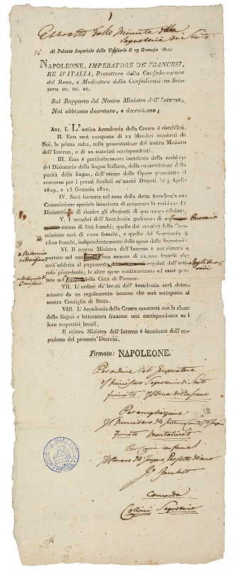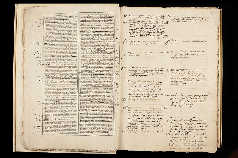 · Lavori preparatori alle cinque edizioni del Vocabolario (1612, 1623, 1691, 1729-1738, 1863-1923) e di documenti relativi alla amministrazione ordinaria dell'Accademia