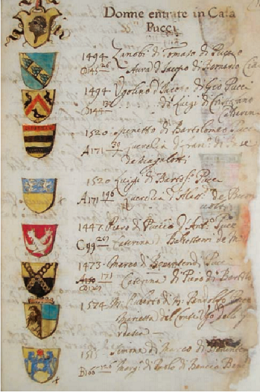Non sono poche le famiglie gentilizie fiorentine che ancora possiedono e abitano le case fatte costruire dai propri antenati nella prima metà del Trecento. Nello spazio urbano a nord della Cattedrale di Santa Maria del Fiore questa continuità può essere osservata su Palazzo Pucci che comprende ancora un intero isolato tra la via omonima, via dei Servi e via Ricasoli. E qui, dove ancora abitano e lavorano i discendenti di quell’Antonio di Puccio che aveva comprato il terreno e le case sulle quali progressivamente presero corpo i diversi edifici che oggi compongono il complesso dei palazzi Pucci, si conserva l’archivio del ramo della famiglia ancora esistente.